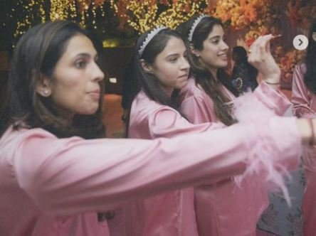 या ब्रायडल शॉवरची थीम पिंक होती. जान्हवी कपूरने आपल्या इन्स्टा स्टोरीवर ब्रायडल शॉवरचे दोन फोटो शेअर केले आहेत. पहिल्या फोटोमध्ये आठ तरुणी पिंक कलरचा ड्रेस घातलेली दिसत आहेत. मध्ये राधिका मर्चेंट बसलेली दिसते.