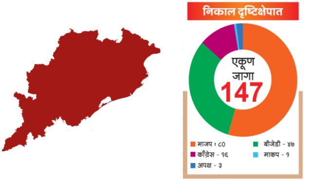 राज्यातील विधानसभेच्या 147 जागांसाठी चार टप्प्यांत मतदान पार पडले होते. अडीच कोटींवर मतदारांनी आपला हक्क बजावल्याने यंदा 74.77 टक्के मतदान झाले. मंगळवारी राज्यातील 70 केंद्रांवर मतमोजणी होऊन रात्री उशिरा निकाल जाहीर करण्यात आला. मतमोजणीत सुरुवातीपासून आघाडी घेतलेल्या भाजपने सत्ता स्थापनेसाठीचा 74 हा जादूई आकडा पार करीत 80 जागांवर विजय मिळविला. पटनायक यांच्या बीजेडीच्या जागा निम्म्याने घटल्याचे या निकालावरून स्पष्ट झाले. पक्षाला यावेळी अवघ्या 47 जागा जिंकता आल्या. दुसरीकडे 16 जागांवर काँग्रेसचे उमेदवार विजयी झाले; तर माकपला एका जागेवर विजय मिळविता आला. तीन अपक्षही निवडून आले आहेत.